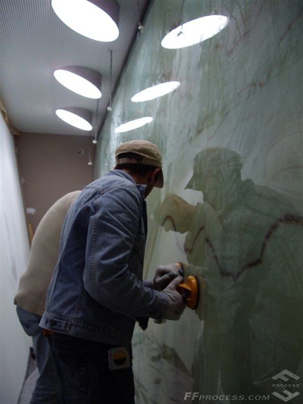 Thin slab of stone material laminated with glass sheets by FFPROCESS